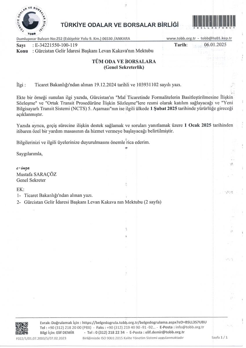 Türkiye Odalar ve Borsalar Birliği'nden alınan yazıda (TOBB); Ticaret Bakanlığı'nın yazısına atfen, Gürcistan'ın "Mal Ticaretinde Formalitelerin Basitleştirilmesine İlişkin Sözleşme" ve "Ortak Transit Prosedürüne İlişkin Sözleşme"lere resmi olarak katılım sağlayacağı ve "Yeni Bilgisayarlı Transit Sistemi (NCTS) 5. Aşaması"nın ise ilgili ülkede 1 Şubat 2025 tarihinde yürürlüğe gireceği açıklanmaktadır.